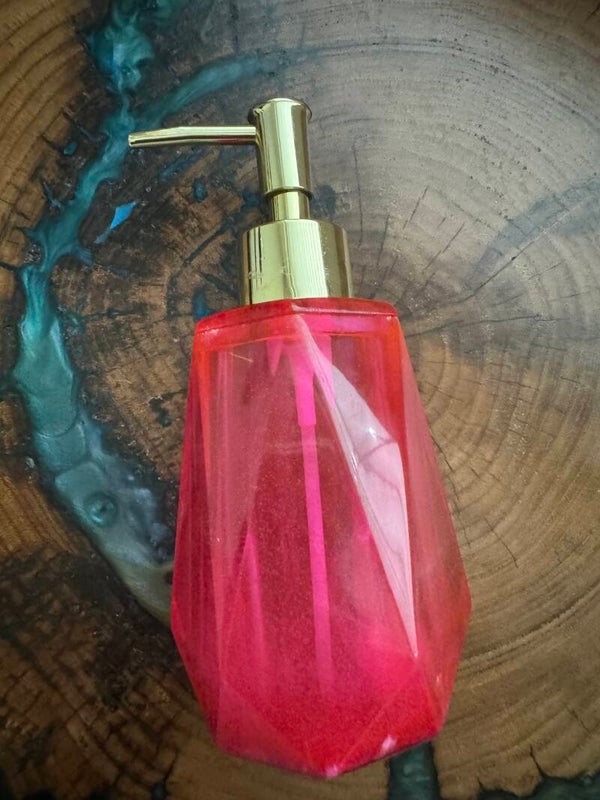 Wunderschöner Seifenspender aus Epoxid in rosa durchsichtig mit goldenen Spender.