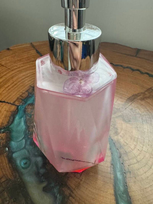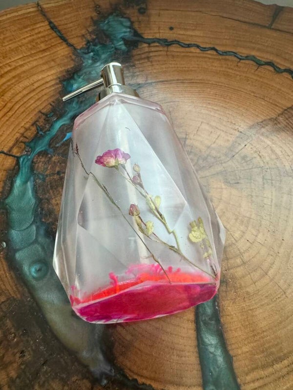 Wunderschöner Seifenspender aus Epoxid in surchsichtig mit getrockneten Blumen, Boden in pink und silbernen Spender.